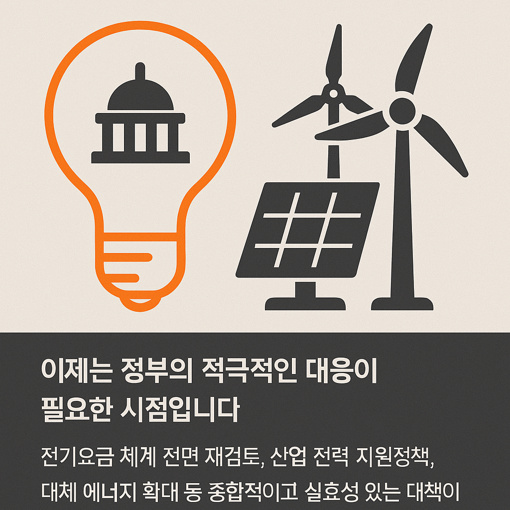 이제는 정부의 적극적인 대응이 필요한 시점입니다. 전기요금 체계 전면 재검토, 산업 전력 지원정책, 대체 에너지 확대 등 종합적이고 실효성 있는 대책이 필요합니다. 기업 혼자서는 이 위기를 버티기 어렵습니다.